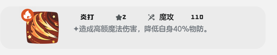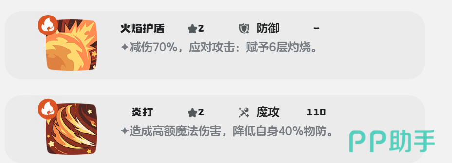 火焰护盾+炎打+淬火+爆裂飞弹这套技能搭配上主要是以魔法攻击为主的,火焰护盾的效果就不用多说了,爆裂飞弹和炎打都属于威力比较高的魔法攻击技能,爆裂飞弹的魔攻有160点,炎打的魔攻有110点,不过炎打在降低自身40%物理防御的基础上可以直接使伤害翻倍,淬火则使可以减少80%的伤害,下回合还能直接使伤害翻倍。