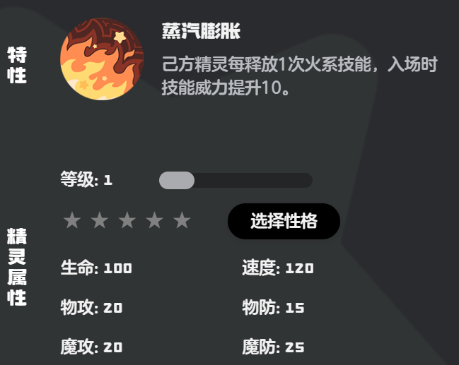 它的生命值为100、速度120、物攻和魔攻分别为20,物防15、魔防25,那我们在给它选择技能时,完全就可以选择物理防御比较高一点的技能,在加上烈焰守护的火属性还能带来灼烧的效果,那技能搭配的选择性就更广了,这里可以使用火焰护盾+山火+灼伤+火焰冲锋或者是火焰护盾+炎打+淬火+爆裂飞弹。