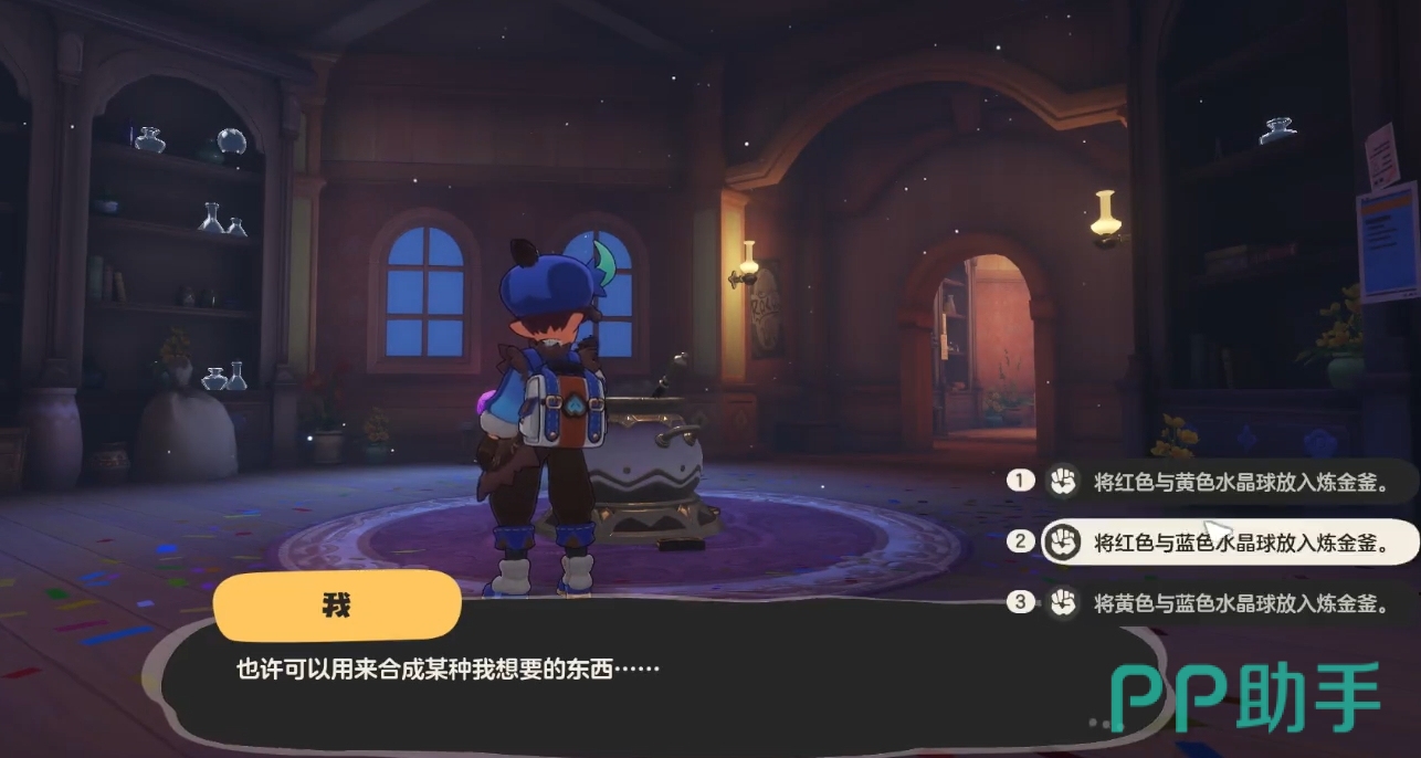 该秘境具体玩法就是提交对应的水晶球来解锁机关。第一个房间需要黄色水晶球,各位可在后方的架子上找到它,就能开启机关前往第二个房间。第二个房间需要提交紫色和绿色的水晶球,玩家可先将里面的水晶球拿完,然后在炼金壶用红色、蓝色水晶球合成紫色,黄色、蓝色水晶球合成绿色,就能顺利过关。
