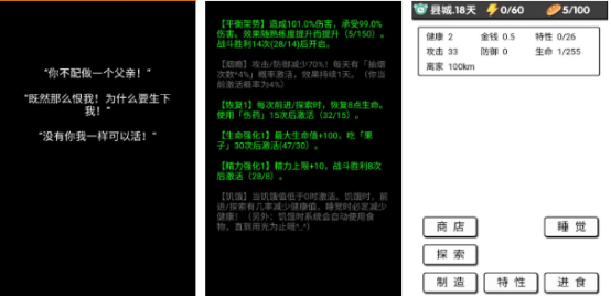 具有特色的文字冒险手游,将扮演一名离家出走的小男孩,仅只有16岁突然间来到荒野当中,在充满危险与危机的荒野当中求生。游戏拥有相当出色的剧情,足够丝滑的独特模式,看似以文字这样的简单玩法反映,却能展现出社会的现实问题以及险恶的人性。可能会触发很多随机事件,比如遇到毒蛇猛兽,遇到他人的打击等等,要通过各种合适的方式去解决。