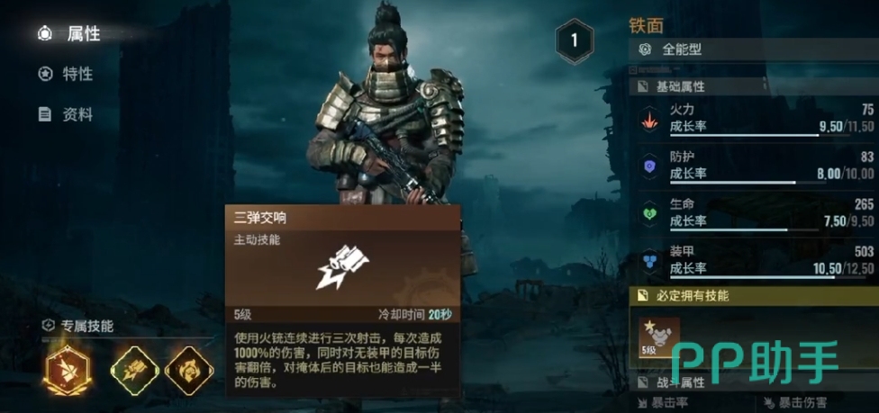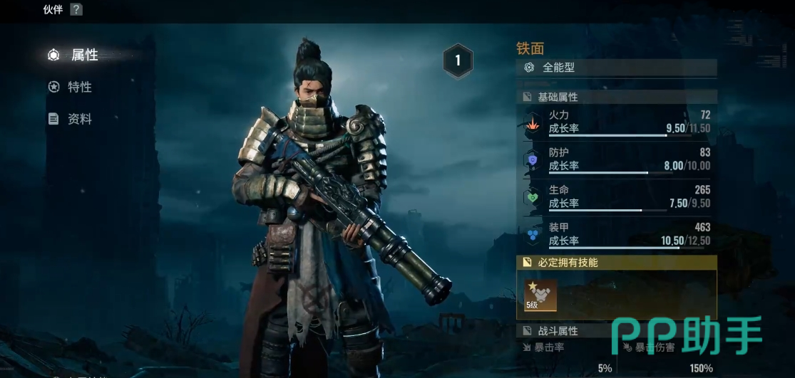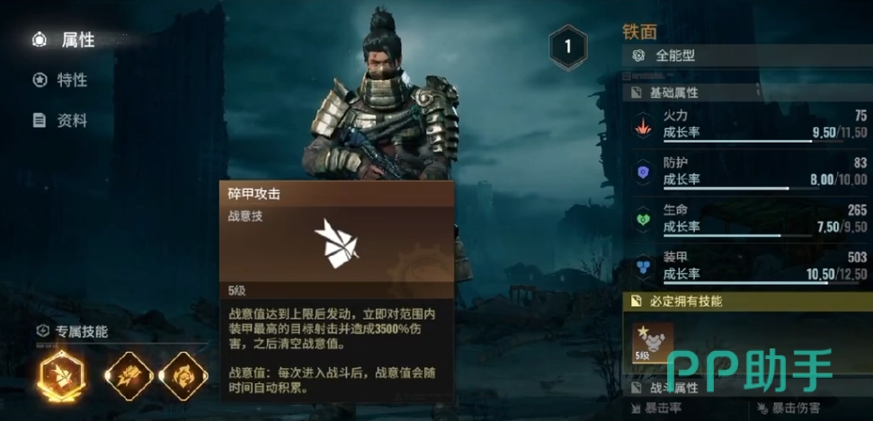 铁面是一个全能型的伙伴,拥有3个专属技能和必带技能: