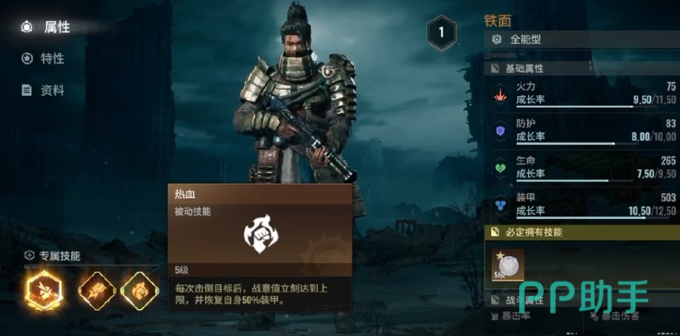 3、被动技热血。这个技能在成功击杀目标以后生效,还能附带增加角色的战意值和回复护甲的效果。
