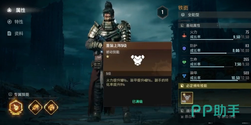4、必待技能重装上阵。这也是一个被动技能,可以增加角色的输出以及防御能力。这个技能给角色带来一定属性数值的加成,特别是对其防御能力的提升,提升幅度较大。