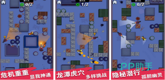 简单易上手的操作方式也是以刺客作为主要的题材,您在这里将要化身成为其中的主角。在面对各种各样的敌军时,必须要合理规划路线,还要仔细斟酌顺利完成各种刺杀的任务,玩家也会以上帝的视角观看整张地图,地图上的每个细节都展现的淋漓尽致,在沿途还会有很多的钻石等待玩家收集,可利用大量的钻石兑换先进的武器。