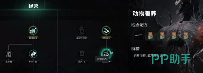 第二个方法,那就是驯养,游戏中是有设定养殖的玩法的,找到二阶段模因的序列4,就能将科技动物抓捕,以及动物驯养给解锁了,顺利开启后,可以直接去工艺台制作麻醉飞针的工具,因为牛具有较大的重量,在捕捉时可携带拓展背包,这样抓住之后也能自由行动,可以使用电炉制作牛所需的饲料。