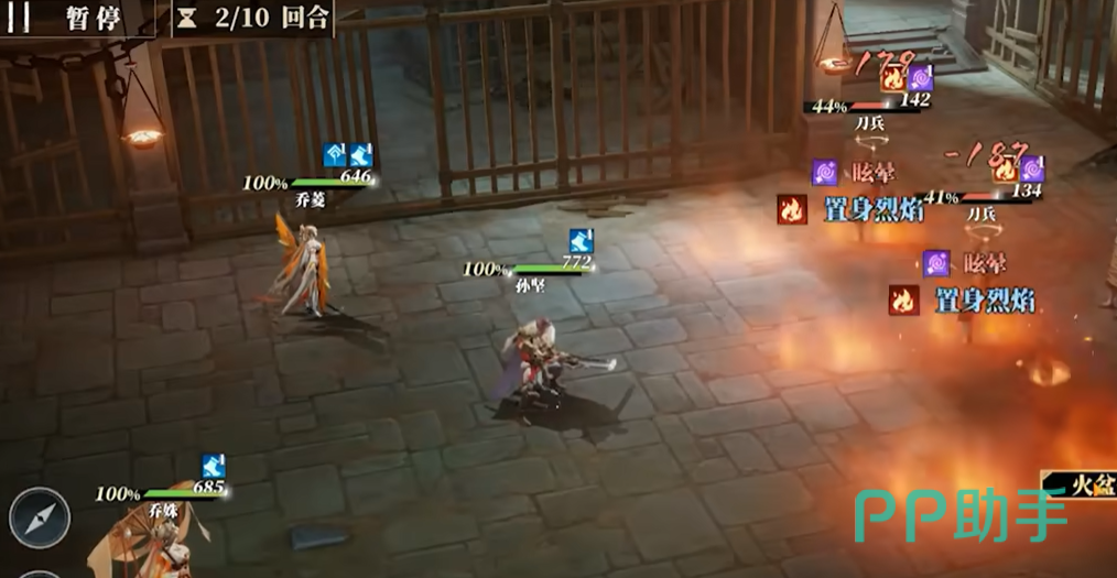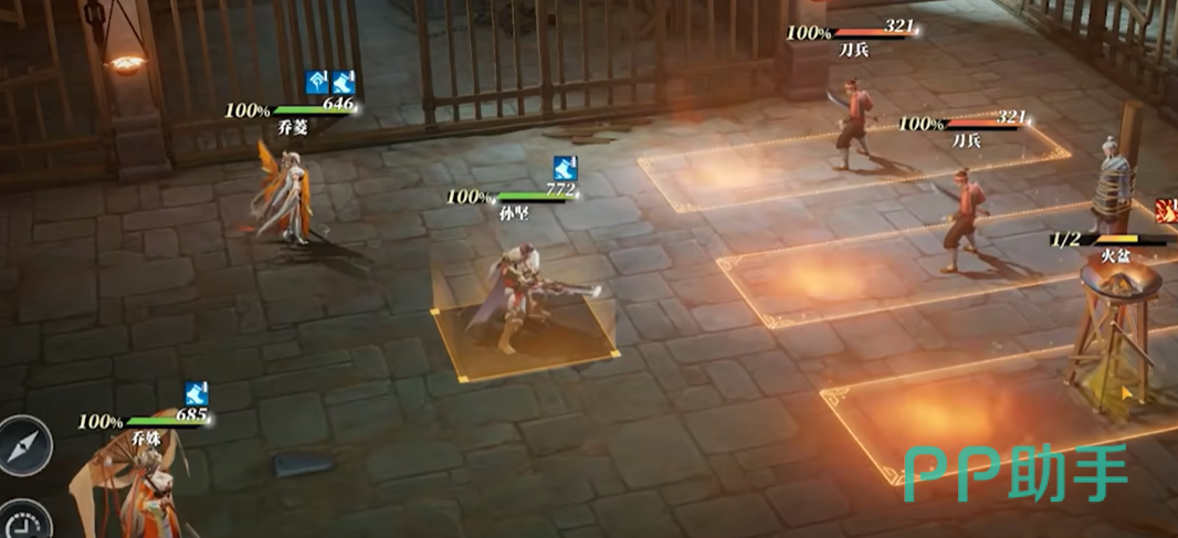 比如说火盆机关,这个机关的触发条件就是攻击两次,当玩家任意攻击两次以后,这个火盆就会倾倒,对周围的敌人造成第一段伤害人,然后对竖排的所有敌人造成火焰伤害,这个伤害一旦触发,该关卡的小怪血量全部为半血,这样方便后续武将进行残血收割了。