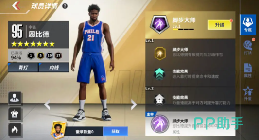 恩比德司职中锋,拥有多种不一样的技能,例如有内线,还有背打标签。专属技能还可以大幅度的提升命中的几率,还有速度,可以有效增强突破时的过人能力。专属的动作还可以让他拥有一个比较敏捷的后卫动作包。主宰技能可以迅速地提升自身的速度以及投篮的命中几率。