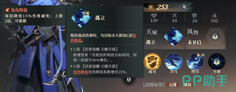 张邰所拥有的独特天赋孤立是每当他使用绝技造成伤害时,目标将永久附加1层免伤,每层免伤降低可削减目标15%的减伤,后期升级的效果就变成了若绝技的两段攻击命中同一目标,则第二段伤害将会提升50%,这一效果让他的攻击更加具有爆发力,而升级至3级武将觉醒天赋升级后,免伤降低的系数会进一步提升至25%。