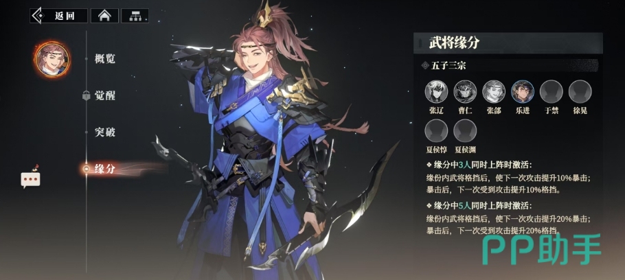 张邰的武将缘分羁绊效果为五子三宗,当缘分中的3人同时上阵时,缘份内武将格挡后,下一次攻击会有10%的几率产生暴击,而暴击发生后,下一次受到攻击时也会有10%的几率成功格挡,若缘分中的5人同时上阵,这些效果则会进一步加强,格挡后下一次攻击提升20%暴击,暴击后下一次受到攻击提升20%格挡,其中能够触发羁绊的武将包括张辽、曹仁、张邰、乐进、于禁、徐晃、夏侯惇以及夏侯渊等,大家在游戏后期组队时,可以参考这些武将的组合来组建队伍哦。