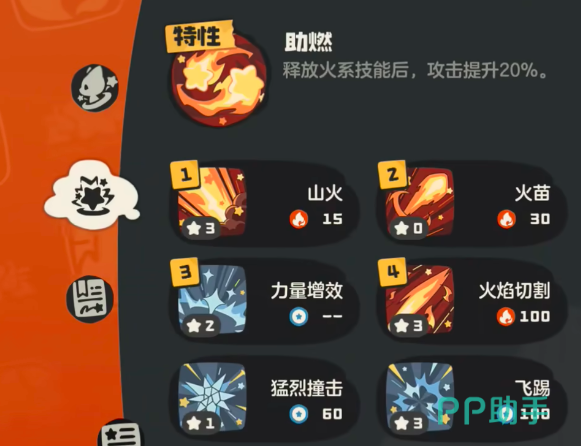 火神这个角色在性格设定上无所谓,小伙伴们可以根据自己的需要进行设定。在技能方面的话,需要设定山火和火苗这两大技能,这两个技能达到45~50级的火神就可以自学了。其他两个技能建议使用力量增效、火焰切割,火神具有助燃的特性,在成功释放火系技能后,可提升20%的攻击,而这一技能,则可以为后续的威力叠加锦上添花。