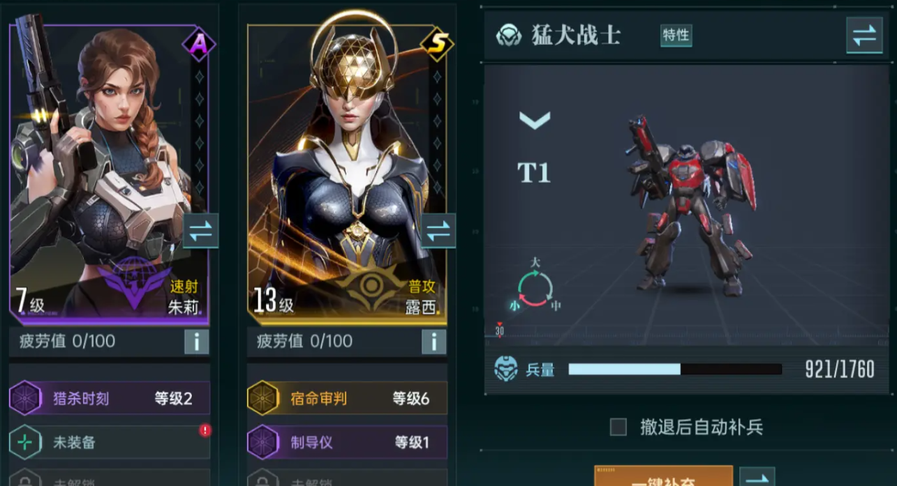 第二个角色搭配露西,具备有宿命审判能力,露西的基础攻击倍率非常高,搭乘朱莉为露西提供的攻击效果加成,可以在倾刻之间秒杀敌人,并且附带有制导仪能力,在击杀敌人后,还能够为自己提升护盾数值,攻速流派兵种选用直接使用猛犬战士即可。