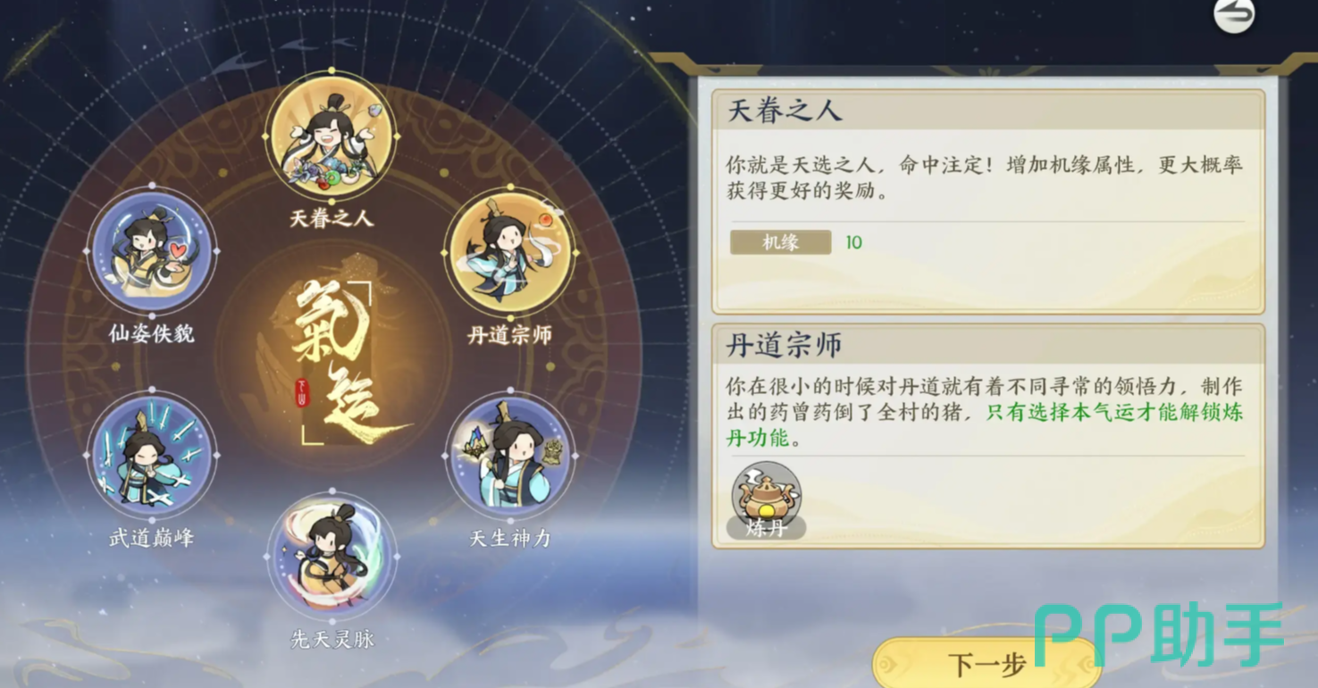如若玩家选择天眷之人,那么基础的机遇属性值会增加十点,若玩家选择丹道宗师,那么可以获取的炼丹数值就会更高,建议新手玩家,在游戏初期,直接选择丹道宗师,增加自己获取丹药的概率。