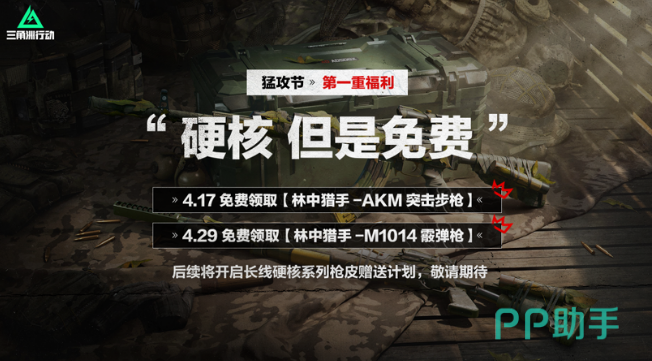 此外,4.29~5.5将迎来三角洲的专属节日——猛攻节。官方会大家带去三重福利,玩家们可以通过登录游戏完成任务领取AKM和M1014的林中猎手系列外观。同时,还将有全新活动玩法、猛猛冲锋的玩法机制以及神秘的重磅福利等着大家,给每一位玩家带来无与伦比的节日体验。