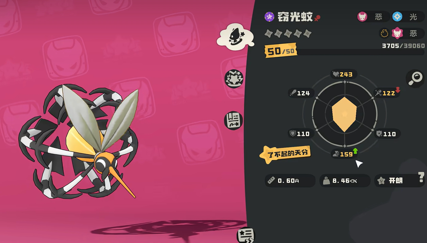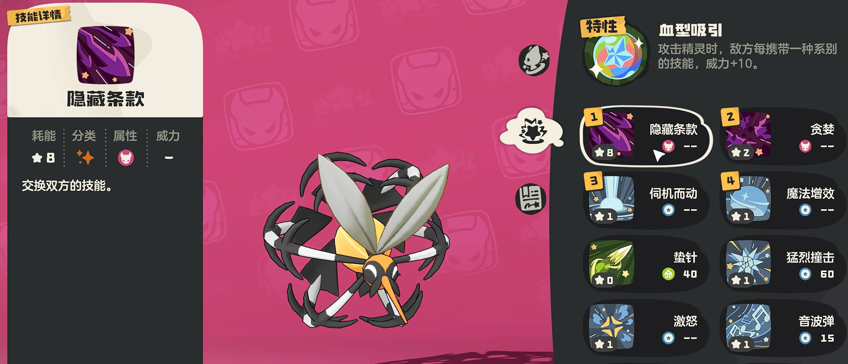 单从种族值等方面来看,窃光蚊的强度并不算强势,但它在升到五十级后,会解锁隐藏条款这个技能,能交换双方的技能,使得boss无法再放出强力技能,能极大地降低人们在boss战中的风险,而这也是窃光蚊会在boss战中变得流行的原因。因此,在搭配技能时,也需要围绕隐藏条款这个技能来进行。