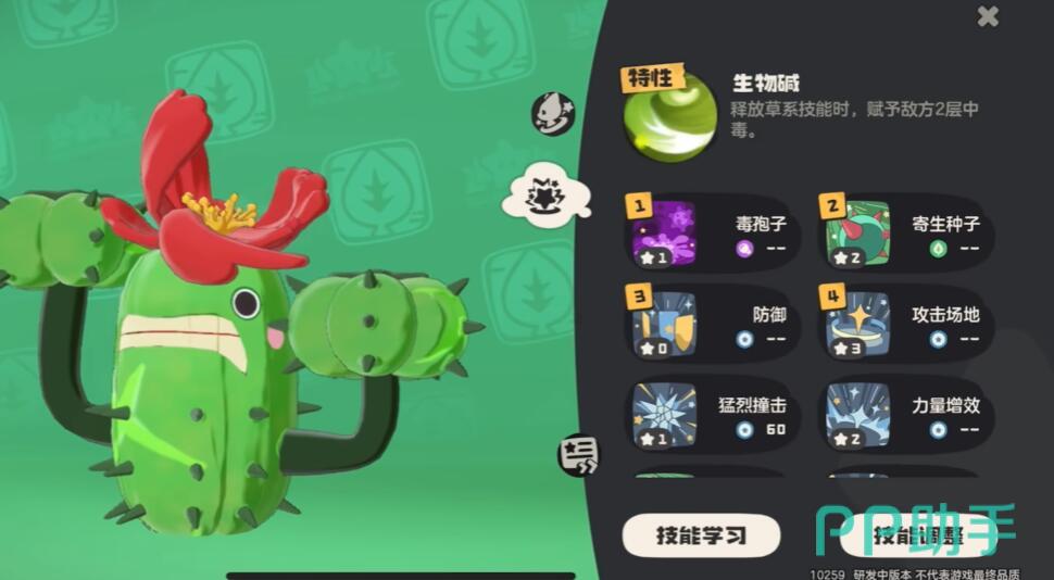 蹦蹦花的技能组以中毒与控制为核心。推荐携带寄生种子(每回合吸血8%)、毒液渗透(基础中毒+伤害增益)作为主要输出手段,搭配藤绞(物理伤害+回能)快速积累能量,以及落井下毒(负面效果翻倍)强化消耗能力。特性生物碱使草系技能额外附加两层中毒,与技能联动可快速叠毒。由于自身爆发力较弱,建议作为副输出或控场辅助使用,避免正面硬刚高爆发敌人。