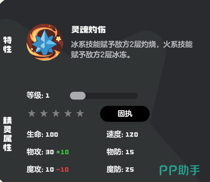 它的特性还是灵魂灼烧,在使用丙烯技能战斗时,可以给敌人施加上2层灼烧的效果,等使用火属性对敌时又能给加上2层冰冻的效果,这种独特的特性染发它的技能给敌人带来更强的打击效果,输出伤害变得更持久。