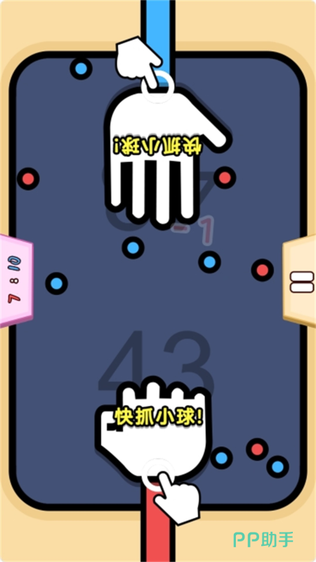 开始后双方通过猜拳的方式来决定选择的颜色,分配好颜色后,玩家只能抓取相同演的的小球,每次小球会变颜色,需要在规定的时间内将所能看到球抓到手里放进规定的容器内,看谁的小球在规定的时间内抓的多,抓的对,游戏整体简单,是可以和在一起的时候一款很好的互动性的游戏。