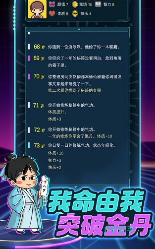 一款以人生历程为蓝本打造的休闲文字类游戏,游戏内设有大量选项与随机事件,玩家的每一次抉择都将悄然改变后续剧情的走向。游戏还贴心地为玩家设定了颜值和体质以及家境等初始属性,这些属性如同人生的基石,将深刻影响玩家的未来轨迹。在游戏中不断积累经验,玩家将逐渐变得更为强大,每一次机遇的把握都将为玩家的人生增添更多可能。