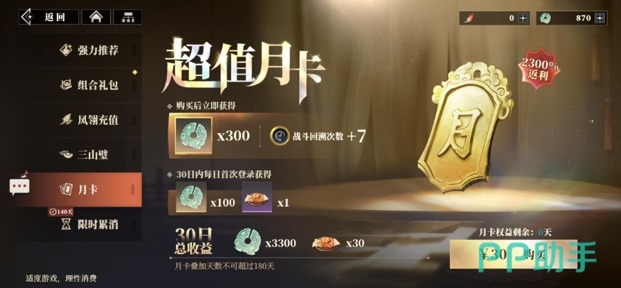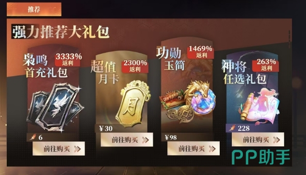 而超值月卡,则是强烈建议玩家进行氪金的项目,游戏中的月卡售价极为亲民,仅需30元即可轻松入手,然而它所包含的核心资源却十分丰富且极具价值,其中包括玉露花,这是一种提升武将好感度的关键物品,除了玉露花之外,月卡还包含了三山壁,这可是获取各种珍稀道具和材料的重要货币,后期的珍贵物品,比如限量版的武将皮肤、特殊的装备符文等都是有机会在月卡中拿到的哦。