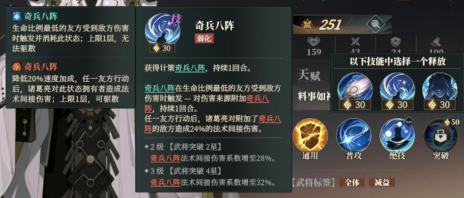 诸葛亮的星级突破至三星临界点,其技能树将完全展开,形成控场削弱干扰的复合型战术体系,他的空城计作为防御向绝技,通过叠加虚妄debuff使敌方全体增伤效果降低25%,值得注意的是该技能与曹仁的坚壁免伤存在乘法叠加,配合甄姬治疗可构建三重防护体系,奇门八阵则展现诸葛亮的攻守一体特质,在施加30%缓速效果的同时,通过独特触发机制每回合造成目标最大生命值12%的法术真实伤害,与周瑜的烽火连营灼烧效果形成完美联动。