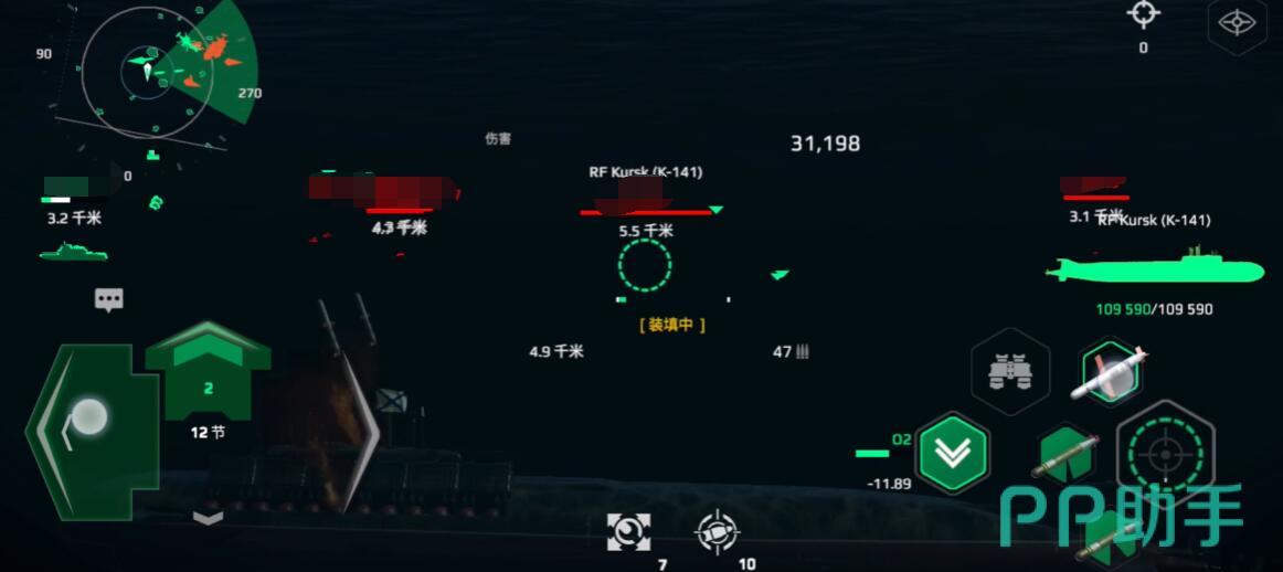 开局直接下潜到150米以下,保持静默航行。优先攻击航母或驱逐舰,用战斧导弹远程消耗,发射后立刻下潜冷却声呐信号。遇到反潜机或驱逐舰开启热诱弹+急速下潜至300米可以利用海底山脉遮挡信号。同时用HUWS鱼雷反打。残血时别硬扛,直接深潜到300米极限深度,等维修技能冷却。