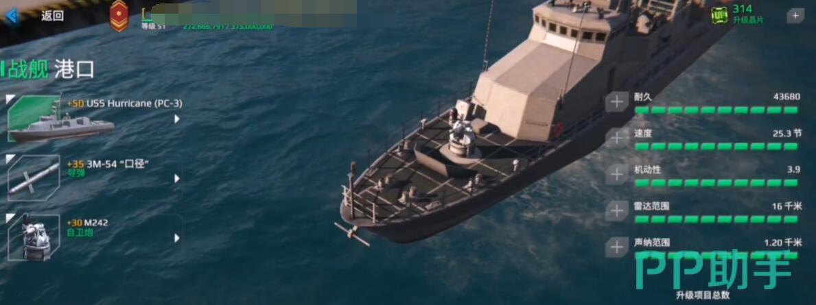 一级船防空能力普遍较弱,推荐用PC3飓风号或022型。PC3的防空槽仅1-2个,装弯曲导弹(射程近但拦截率高)或守门员机枪(射速快)。实战中优先手动锁定反舰导弹,遇到飞机群直接开热诱弹跑路。一级房飞机威胁小,资源优先升主炮和导弹,防空升蓝色品质即可,省金币买二级船,或者直接跳过二级船。