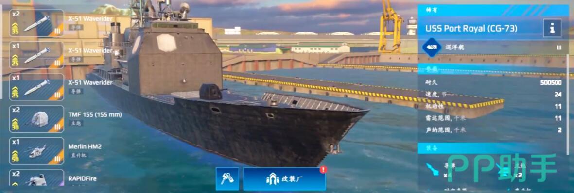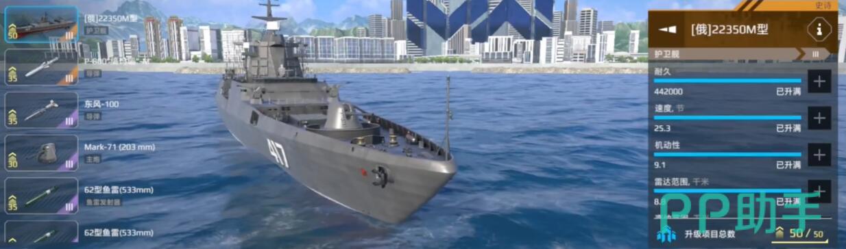高机动突袭型:俄系22350型护卫舰适合游击打法,航速快、转向灵活,能快速穿插战场。航速35节+隐身涂装,主武器带鱼叉导弹打爆发,副炮用密集阵防身。这套配置专克慢速船,但遇到航母容易暴毙,而且主炮也差点意思,记得多找掩体卡视野。
