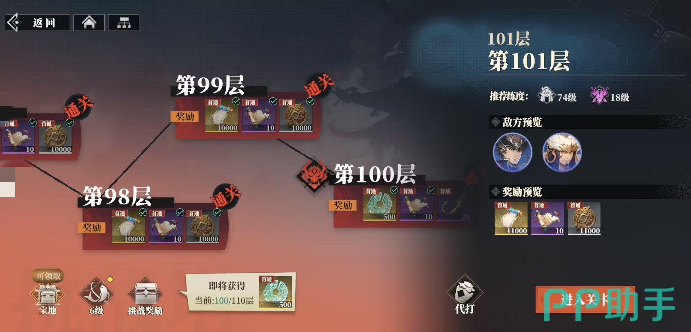 具体的战斗其实并不困难,尤其是在一些常规的层数,更是只要硬件达标之后就可以轻松通关。点击每一层还可以看到有当前的推荐练度,只要能够达到这一练度,基本都可以顺利战胜敌人。还可以提前看一下敌方的预览,这样也能够及时进行阵容的调整。对于一些特别难的关卡,游戏还贴心地推出了代打的服务,在每个关的界面都可以看到有一个代打图标。点击代打之后就可以直接发布任务,其他玩家就可以接取任务,然后帮助大家进行战斗。需要消耗一定量的三山壁,然后获得其他人的帮助,这也是游戏为了减负所推出的一项内容。