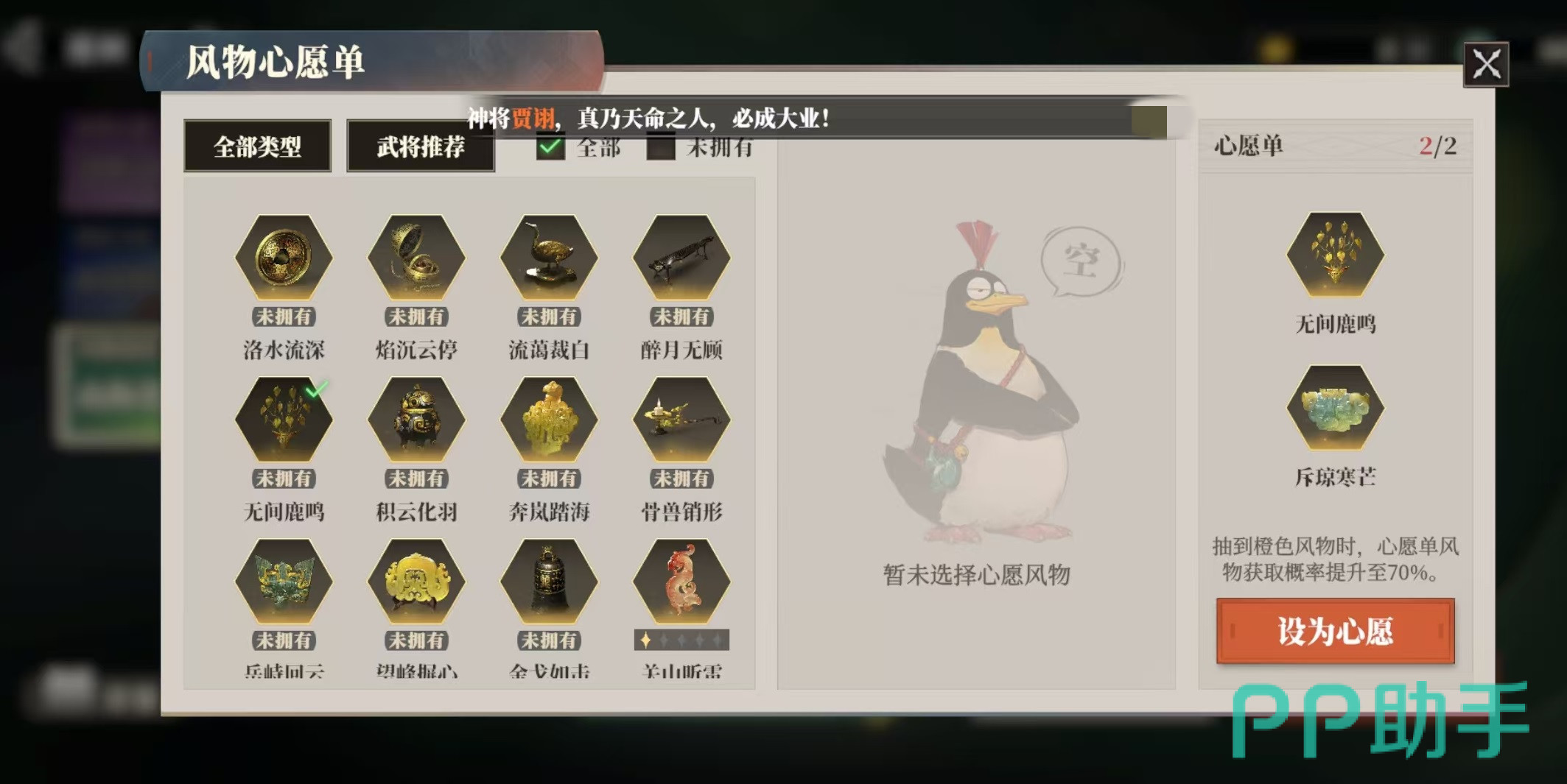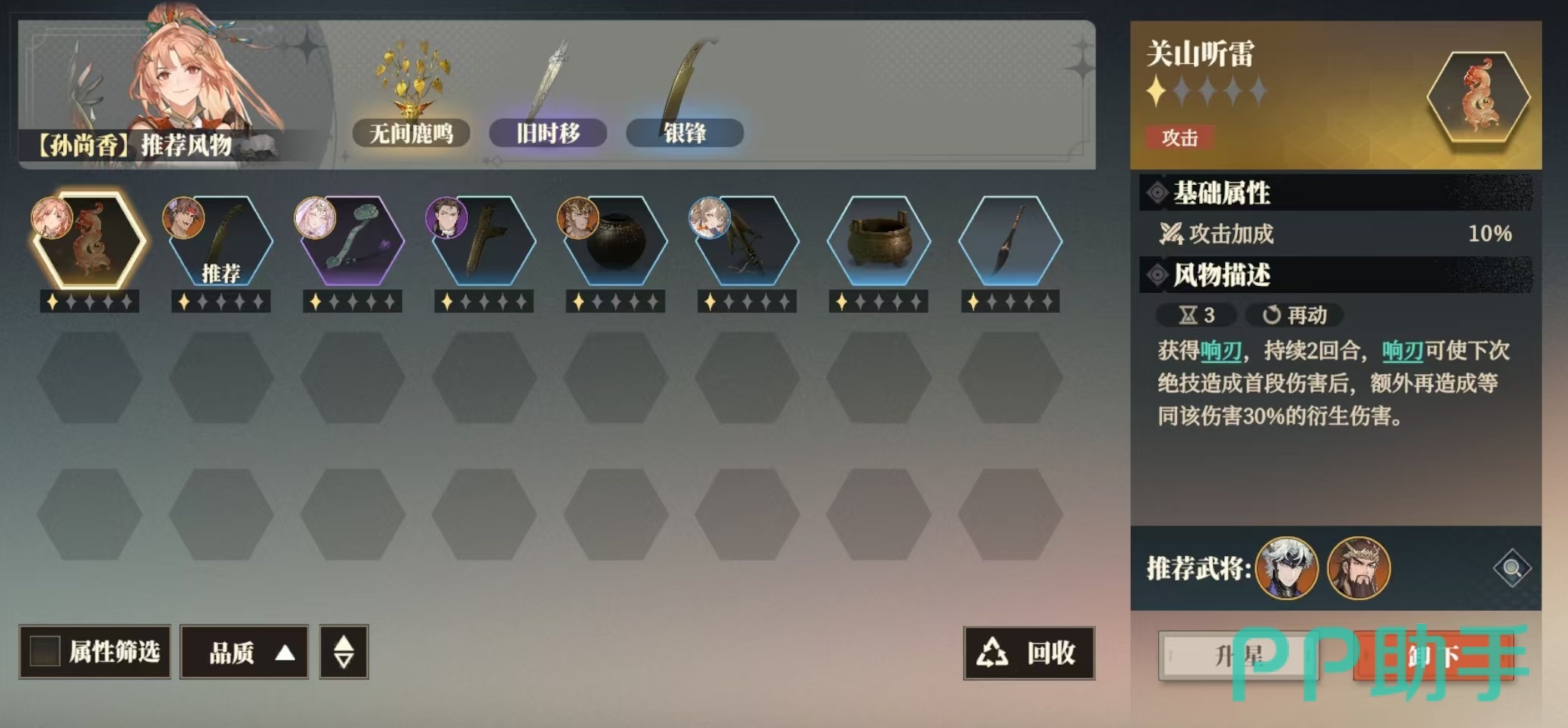 抽取到之后,接下来就是给合适的武将进行装备,一般来说是根据武将需要的核心属性,例如攻击类型的武将,就会选择增加攻击属性的风物。当然也要考虑到附加的效果。例如在一些需要驱散的战斗中,就可以选择带上具有驱散作用的风物,这样可以起到更强的战斗作用。如果不知道如何选择,按系统推荐的去搭配也可以。