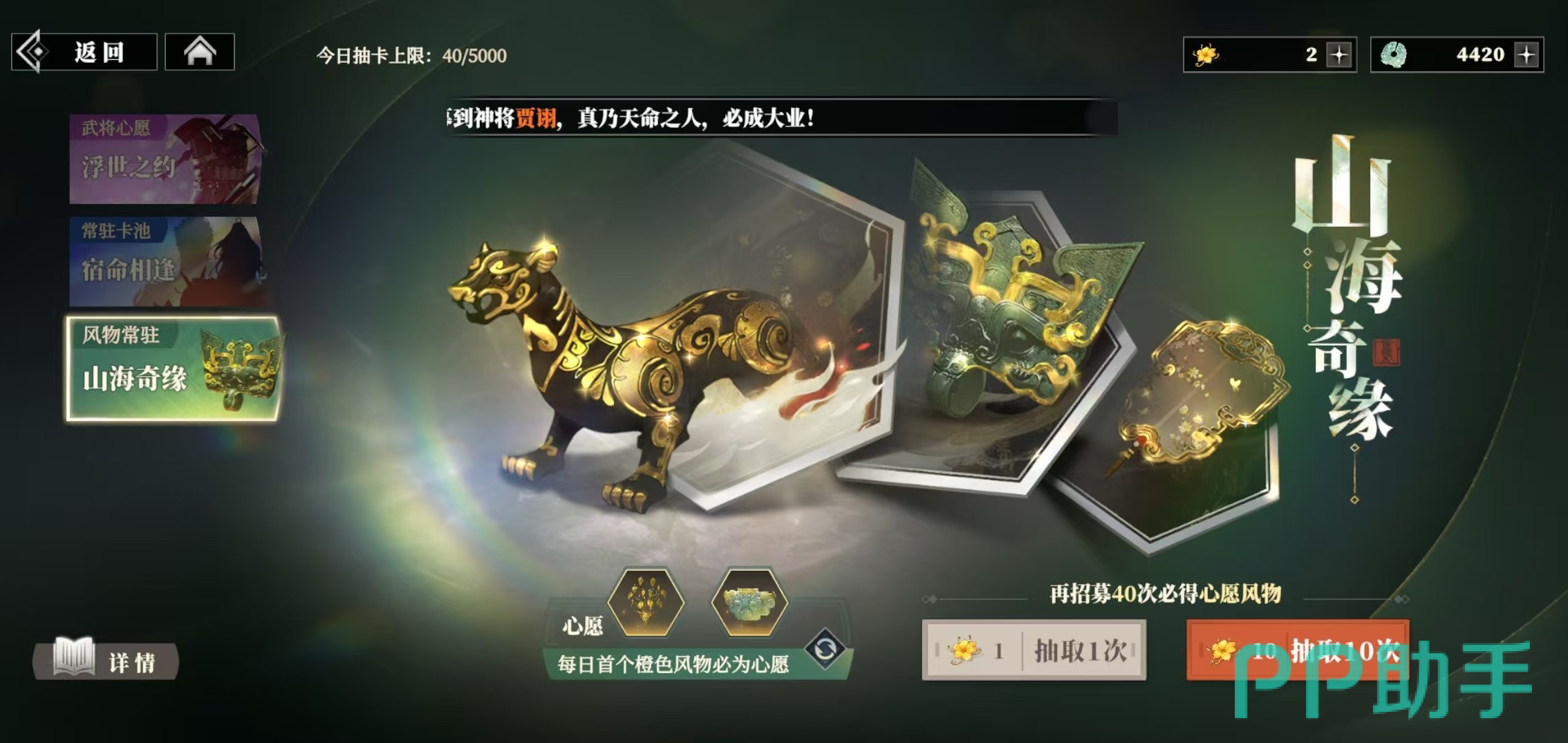 如果想要获得风物,那么主要是通过抽卡的途径。点击招募之后,就可以在卡池中看到有风物常驻卡池山海奇缘。和英雄卡池一样,在这里同样可以进行心愿的设定,每天出现的首个橙色风物,必定会是设置好的心愿中的一个。大家要根据自己的核心武将来设置心愿,这样可以达到快速养成核心的目的。抽取风物需要扶桑叶,这个道具主要通过充值中的组合礼包,扶桑叶礼包以及三山币兑换等途径来得到,还有部分活动可以赠送。