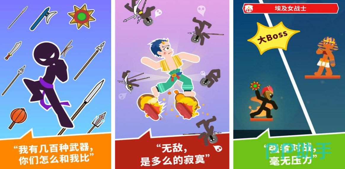 在开局后就会看到非常简约的火柴人形象,只不过这些火柴人都以不同的职业展现出来,有的是埃及女战士,每一种职业都有着超强的战斗实力,您可以携带不同的武器类型,将所有敌人彻底打败每位火柴人角色,手中都会有几十种不同的武器,需要将所有的对手彻底击败。
