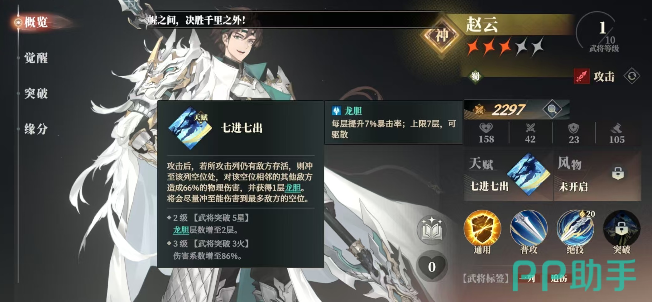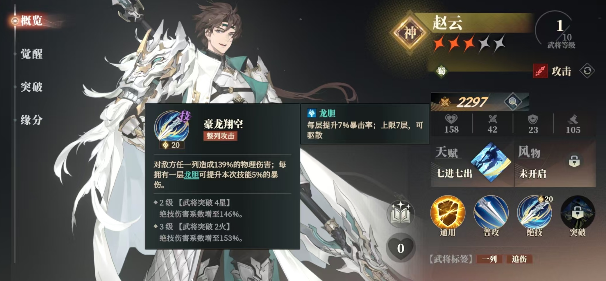 赵云的天赋是七进七出,他在攻击时,如果所选择的攻击列有敌方存活,那么直接冲到该列空位处,对空位相邻其他敌方目标造成一次物理伤害,自身获得一层龙胆。每层龙胆能够提升7%暴击率,上限叠加7层。绝技是豪龙翔空,选中敌方任意一列造成物理伤害,每拥有一层龙胆,可以提升5%的暴击伤害。在突破之后自身回合进行攻击,或者是在敌方回合承受攻击,还能额外提升自身的行动条。