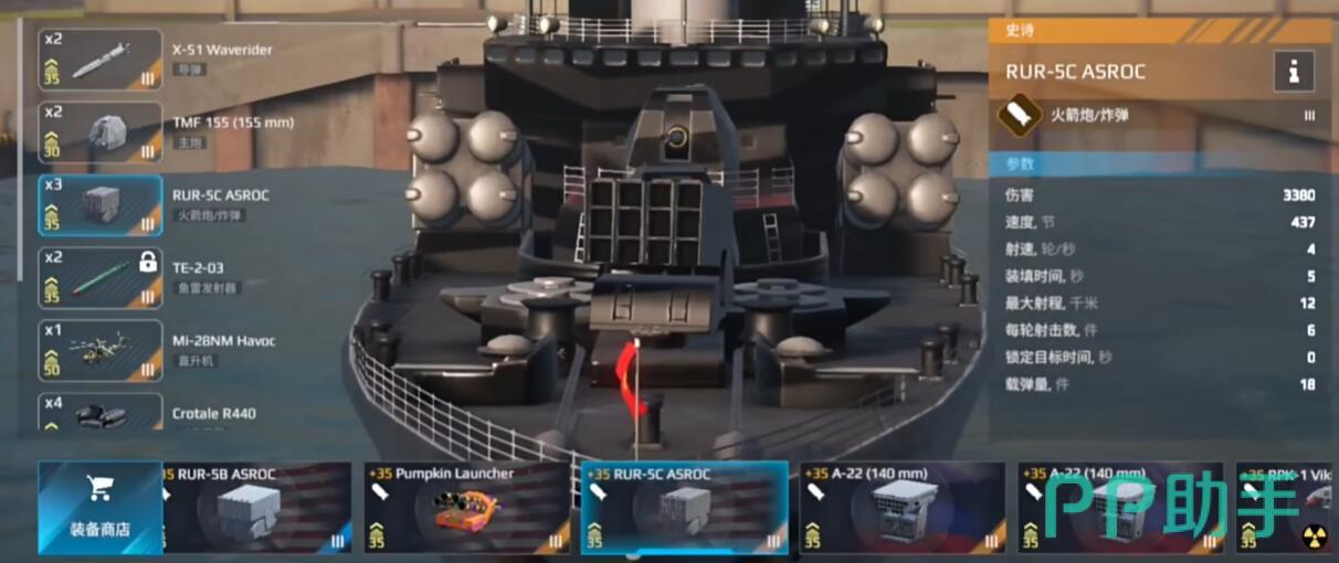 阿斯诺克C射程7.5公里,单轮12发备弹,适合持续压制。推荐搭配高射速主炮(如奥托76)填补装填真空期,防空带铠甲-M拦截导弹。反潜必带鱼鹰直升机侦查标记,潜艇暴露后切火箭炮集火。副武器选旗鱼鱼雷贴脸补刀,但需注意走位安全。
