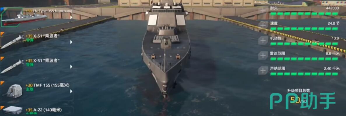 三级船推荐:055南昌舰,这属于六边形战士:3导弹槽(推荐X51乘波者)+3主炮(TMF155暴击炮)+2鱼雷(旗鱼贴脸8万)。6个防空槽装海拉姆(拦截导弹)与铠甲-M,手动优先级:反舰导弹>轰炸机。中距离游走集火脆皮目标,残血开维修技能撤退,单排和组队都很不错。
