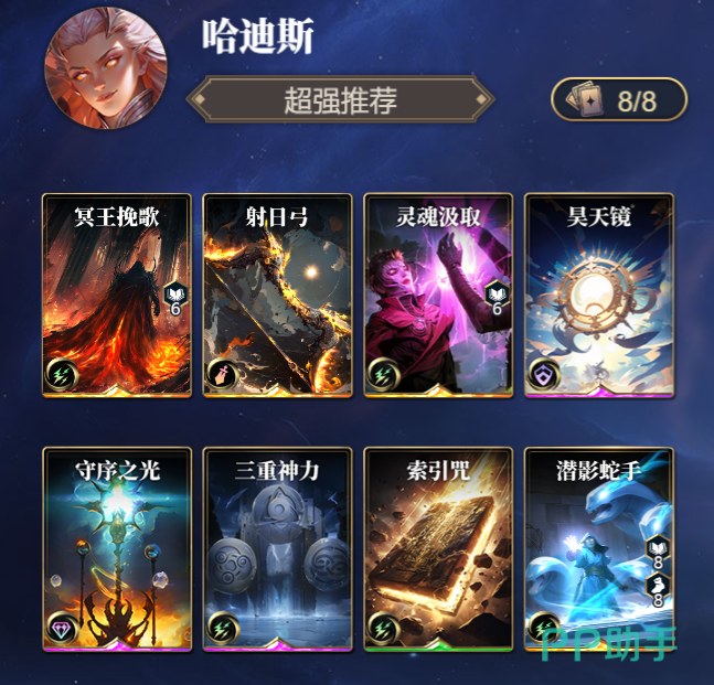 大家在选择核心卡牌的时候,可以先依据古代文明作为传说,然后把它们分成四个不同的组,每个组的神灵都代表着性格和性能,其中冥王哈迪斯,也是游戏中比较受欢迎的,站在阳光下,会让他非常的不适,他更习惯待在于幽深的黑暗中,还会有一个得力助手就是三个头的爱犬克伯洛斯,这个角色整体的故事背景都是非常孤独的,大家会在生命的尽头想起他,还会有他的兄弟宇宙雷电,虽然消失在世界中,但是却又无处不在,长久的居住在领土当中。