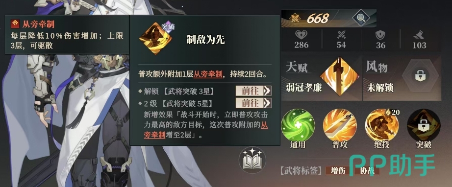 其通用的复苏技能,能够为友方目标注入源源不断的增益效果,带来更强大的战斗力,不仅如此,曹昂还具备从旁牵制的能力,每一层牵制效果,都能够降低敌人10%的伤害增加,而且这一能力最多可以叠加3层,如此一来敌人的攻击威力便会受到限制,不过需要注意的是,和合击的协战效果一样,这从旁牵制的效果并非绝对稳固,它是可以被驱散的。
