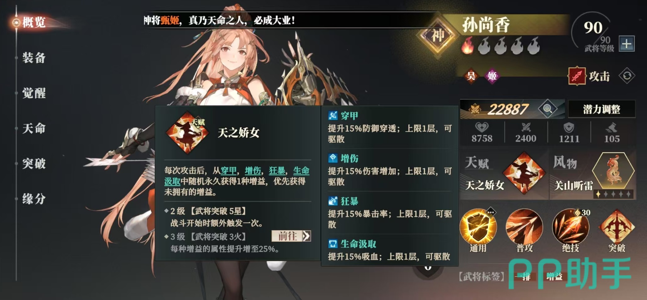 孙尚香这个武将的优势非常明显,它可以利用自身的普攻,对敌方任意目标造成高额单体伤害,绝技是对敌方任意一排造成物理伤害。无论是普攻还是绝技,都可以根据自身身上的增益状态来获得增伤,只要比对方增益多,就有加成。孙尚香的天赋是在每次攻击之后都可以随机获得穿甲、增伤、狂暴、生命汲取等增益中的一种。在进行突破后,如果拥有全部种类的增益,还可以获得额外状态,获得15%速度加成以及额外减益抵抗能力。