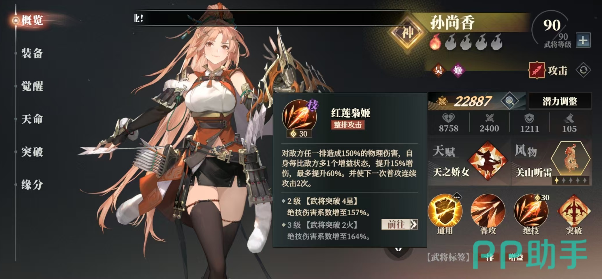 现在大家就搞清楚三国志幻想大陆2枭之歌孙尚香阵容怎么搭配了吧,孙尚香是一个非常有培养价值的武将,不仅是前期,阵容搭配好后可以一直使用很长时间。通过突破和觉醒带来的战力提升,完全能够应对更多的战斗。