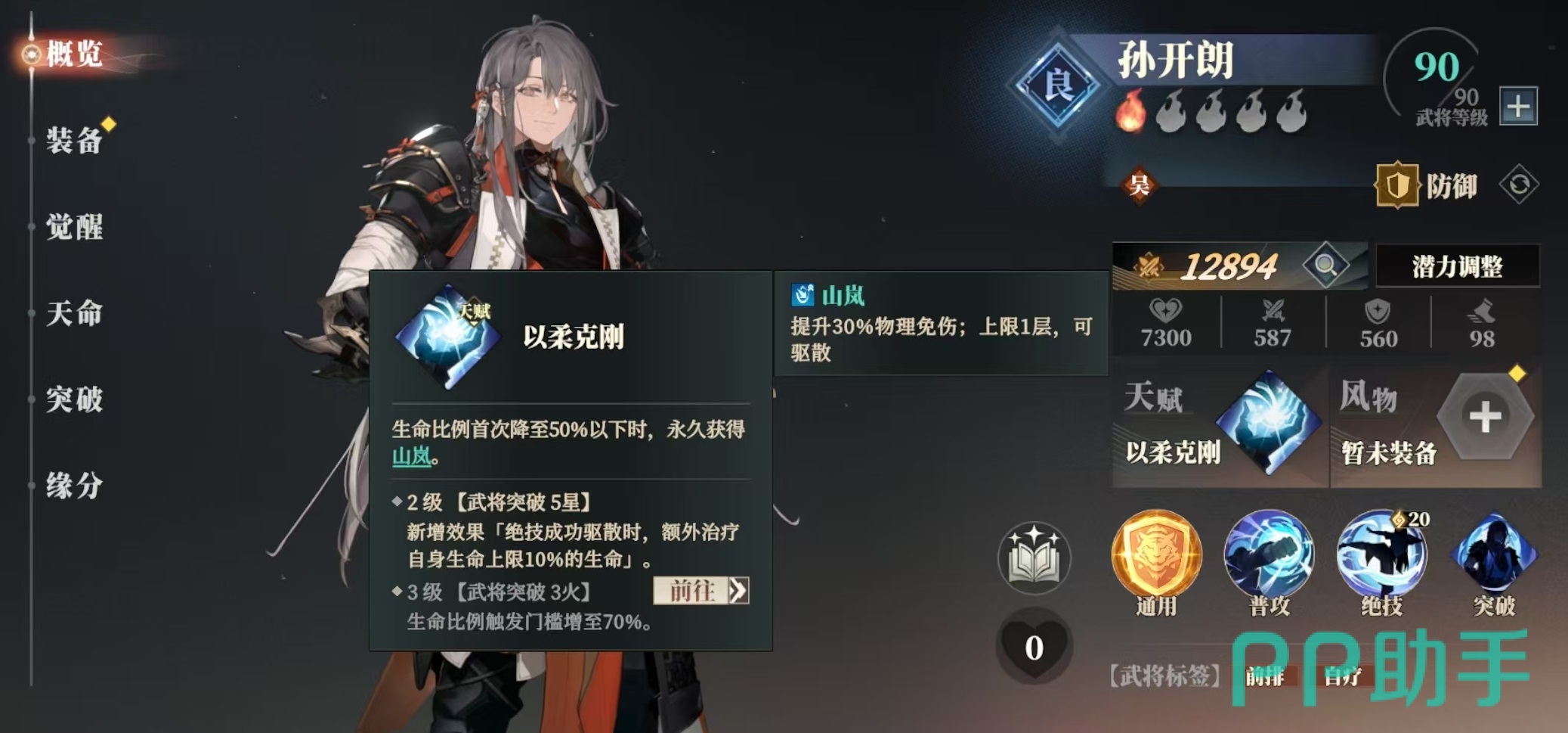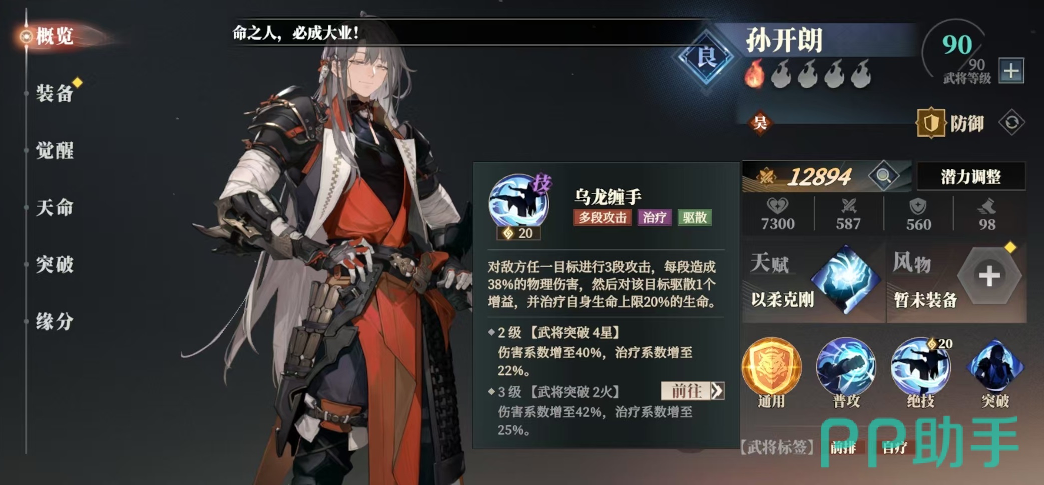 孙开朗是一张被很多玩家都低估的卡牌,它的通用技能是可直接驱散目标身上的增益效果,这一点在很多战斗中都非常有效。普攻对敌方前排目标造成伤害,并使自身获得免伤提升,每一层都能带来10%的伤害减免,上限为5层。绝技是对任意目标进行三段攻击,然后对该目标驱散一个增益状态,并治疗自身生命上限20%的血量。自身的缘分只有孙吴传承这一个,但也只需要缘分中的两人和三人就可以激活效果。