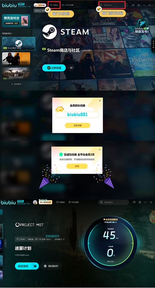 在游戏中,玩家可以通过猎杀来获取一些宝贵的资源,同样也可以凭借自身的实力具有效获取更多的优势。玩家可以选择去静静的观赏,去感受巨物所带来的震撼。玩家在体验游戏时就可以感受,不想游戏出现卡顿的现象,可以选择加速器。在点击以上加速器之后,新用户可以得到一个24小时的加速时长。想要获取更久的加速时长,还可以使用通用口令【biubiu001】兑换长达3天的免费加速时长,一共是免费96小时。