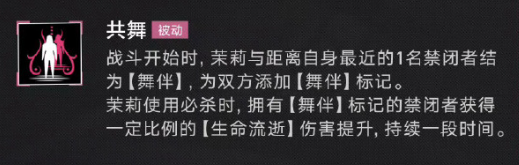 茉莉的被动技能共舞,在战斗开始期间,会对自己距离最近的一名禁闭者结为舞伴,为双方添加舞伴标记,当茉莉使用必杀技能时,拥有舞伴标记的禁闭者,会获得一定比例的生命流逝伤害提升。