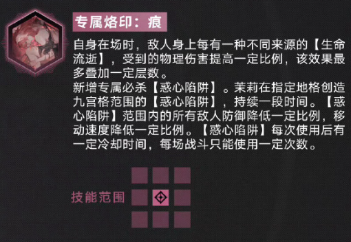 在使用专属烙印痕时,只要茉莉在场,敌人身上都会有一种不同来源的生命流逝,受到的物理伤害比例都会提高,搭配专属必杀惑心陷阱,茉莉可以在指定的九宫格内,直接创造范围陷阱,并且所有踏入陷阱的敌方单位,其防御数值都会降低。