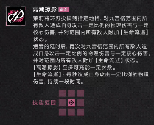 茉莉的必杀技能高潮掠影,会向空中投掷环刃,并且对指定的方格,造成九宫格范围的伤害,同时对附近的所有敌人,附加生命流逝状态,短暂的时间过后,生命流逝可以对敌人造成一定数量的dot伤害。