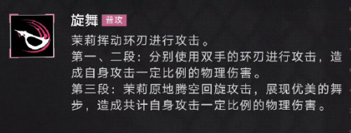 茉莉的主动攻击技能叫做旋舞,茉莉可以挥动环刃,对敌方展开攻击,第一段、第二段分别对敌人造成双手环刃攻击,第三段伤害判定时,茉莉会腾空而起,造成回旋性伤害。