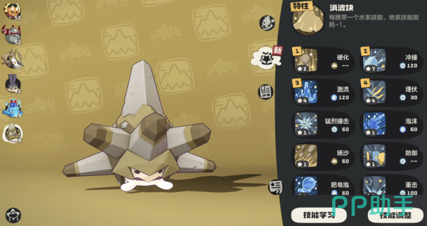 在水系技能的选择上,可以考虑“激流”或“泡沫”,这类技能通常附带减速或控制效果,不仅可以触发“消波块”效果,还能有效干扰敌方输出节奏。而“岩甲强化”则是嗜波螺的核心防御技能,它能够提升自身的物防和魔防,可以叠加两次,大幅度提升生存能力。如果想进一步加强抵御魔法攻击的能力,还可以搭配“防御”或“水泡盾”等防御类技能,在关键时刻起到稳定局面的作用。