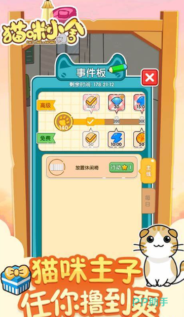 玩家在消除关卡中需要动动脑筋,把相同颜色的方块连在一起消除,每通过一关就能获得木板、砖块这些装修材料。随着游戏进度推进,你能解锁的装饰品会越来越多——从基础款的猫爬架,到带喷泉的小花园,再到各种风格的墙纸地板。看着空荡荡的猫屋慢慢变成豪华别墅,还能根据自己喜好混搭不同风格的家具,这种成就感特别让人上瘾。