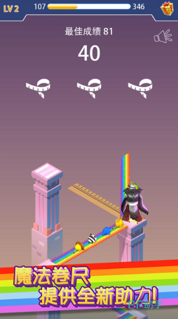 玩家要指挥一个呆萌的小家伙,在五颜六色的彩虹桥上蹦蹦跳跳。这可不是随便蹦跶那么简单,得眼疾手快才能稳住身形,要是脚下一滑就会掉下去。游戏越往后玩越刺激,彩虹桥会变得歪歪扭扭,跑得也越来越快。不过别担心,路上能捡到各种好用的道具,完成挑战还能解锁超多可爱的新造型。