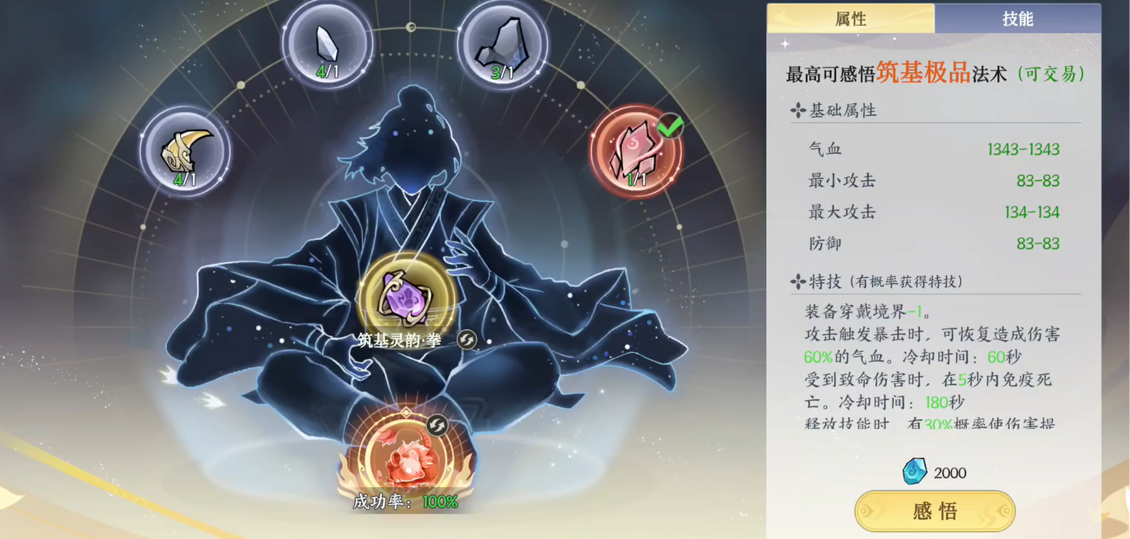 然后想要感悟这一个法术的话,那你还需要准备好四种材料。每一种法术所需要的材料都不一样,不过前期大家不要用红石头。因为这个东西特别珍贵,所以建议用一些品质更低的产量,这样就不会暴殄天物,之后再花费2000灵玉,就可以成功感悟了。