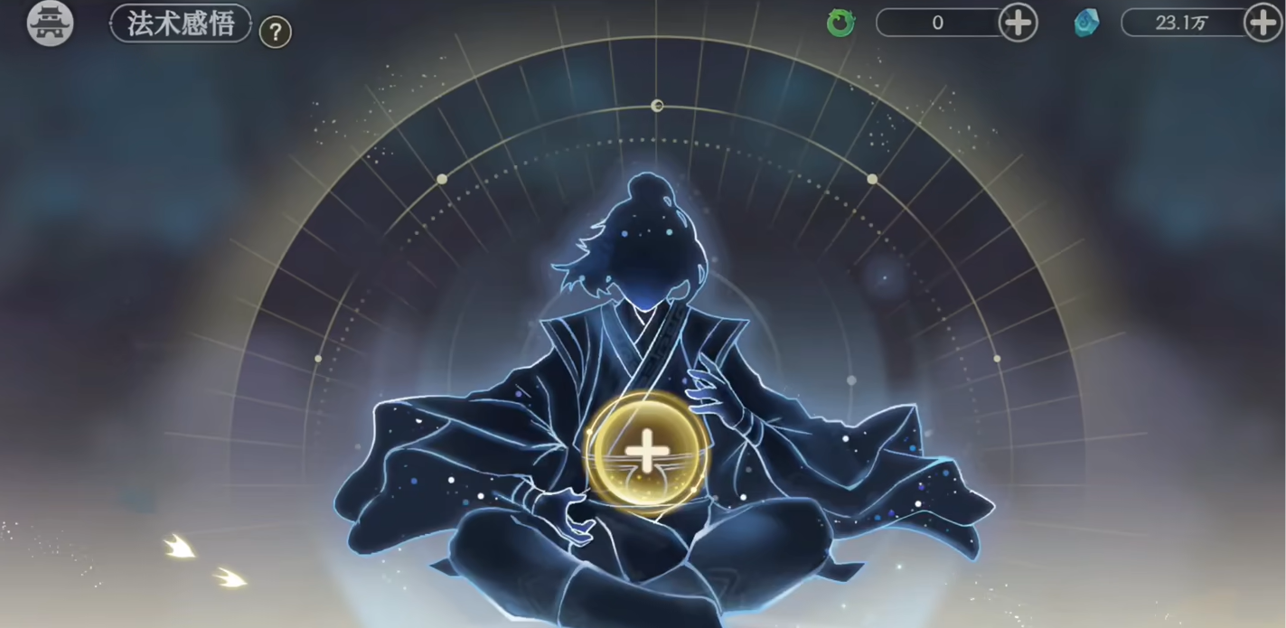 如果大家想要感悟法术的话,可以先点击选项当中的法术感悟。进去之后就可以看到一个正在打坐的人,这时在他的胸口处有一个加号。大家可以点击这个加号,然后就会显示出你当前所拥有的所有法术。