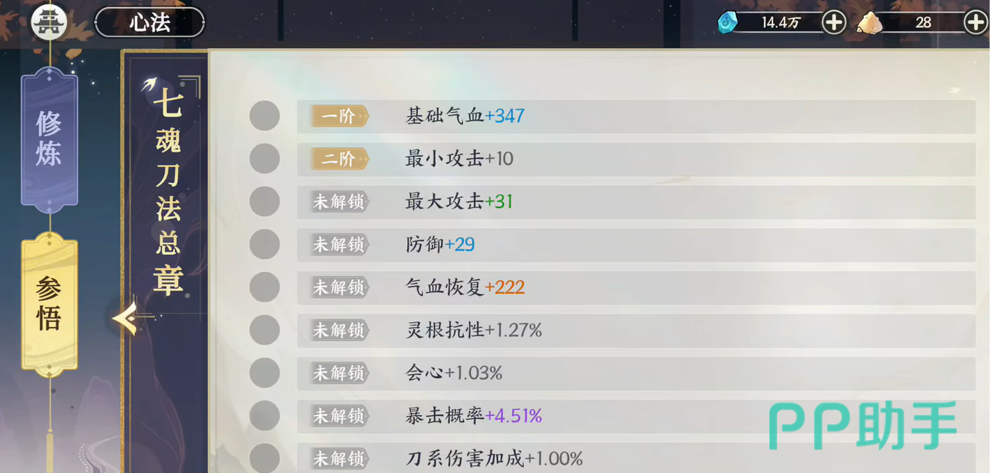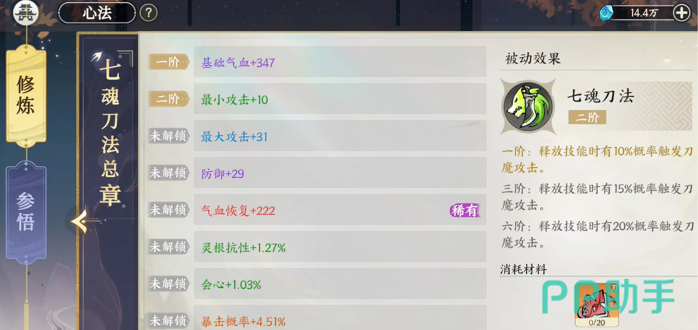 当大家拥有心法之后就可以进行修炼了,修炼成功之后,就可以获得各种效果以及属性提升。以七魂刀法为例,当玩家成功学习并进阶之后。就有一定的概率触发额外的刀锋攻击,随着进阶等级更高了,那就可以提升气血、攻击力、防御力等属性,让人变得更强。